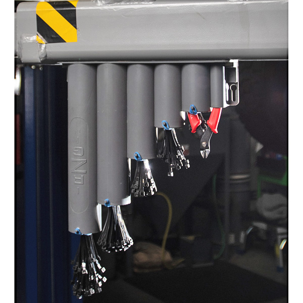We got tired of searching the shop for wherever the last person laid the bag of zip ties down. Now they are in plain sight on the front of the shop tool box. The side cutters leave a nice, clean even cut.