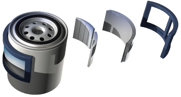 1. Powerful, heat-resistant neodymium alloy magnets are engineered to focus a magnetic field inside your filter. Specifically formulated to remain effective in the most extreme environments, these magnets are guaranteed to remove particles from oil operating at up to 300ºF. (Most magnets start losing magnetism at 180ºF.) 2. Patented Fluxcon™ shielding technology stops magnetic flux which could affect electronic components. Not even a paper clip will stick to the outside of an AeroMag®. FluxCon™ shielding also redirects a portion of that magnetic power back into the filter to increase filtration efficiency. 3. Rugged flexible frame encases and protects the elements of an AeroMag® while providing enough flexibility to fit a range of filter diameters. The proprietary design and materials are rated for temperatures from -40ºF to +300ºF. |