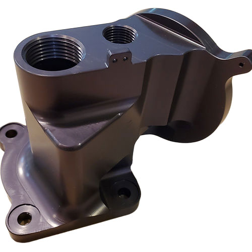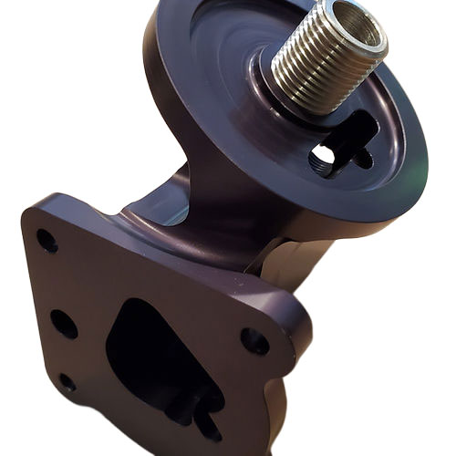 This is an 90 degree oil filter adapter fully machined from 6061-T6 billet aluminum and anodize in black. It is similar to other adapters on the market but only weighs 17.2 oz. made of billet rather than cast aluminum.