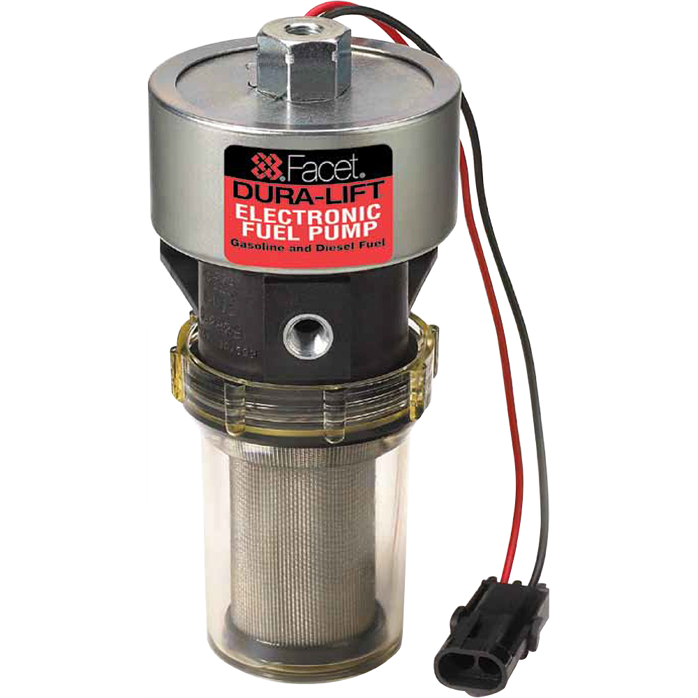 Note: Facet fuel pumps are not FAA approved and are not intended for aircraft use. • Application: Refrigeration trucks, marine generator sets, diesel filtration systems, industrial applications, and other diesel lift applications. These pumps are rated for diesel fuel, gasoline, blended alcohol fuels, and fuel additives. • Solid State Reliability: Proven on many original equipment applications No electrical contacts. No bearings or diaphragms to wear out or fatigue. Endurance life almost doubles that of our nearest competitor. • Easy to Install-Easy to Service: Two bolt mounting makes installations easy. Nothing to adjust. The pump is self-priming to 120 inches (3.0 m). Vertical mounting is preferred to assure maintenance of rated pressures. The transparent housing allows for visual capability to monitor the cleanliness of the stainless steel filter. • Eliminates Vapor Lock: When properly installed on most vehicles a constant, smooth, dependable supply of fuel under pressure is assured in the hottest weather or in high altitudes. |