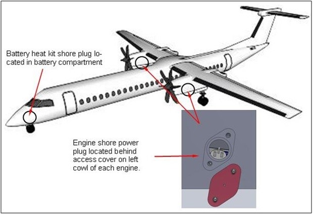 Pratt & Whitney DHC-8 (Q400) | A complete aircraft system supplies 2838 watts with a 24.6 amp draw at 115 volts. Each engine is supplied with 1315 watts with a 11.4 amp draw at 115 volts. The 3 batteries are supplied with 208 watts with a 1.8 amp draw at 115 volts. | Fixed Wing Preheat System - DHC-8 Q400 PW150 - 115 Volt | 05-14781 | $18593.00 | |