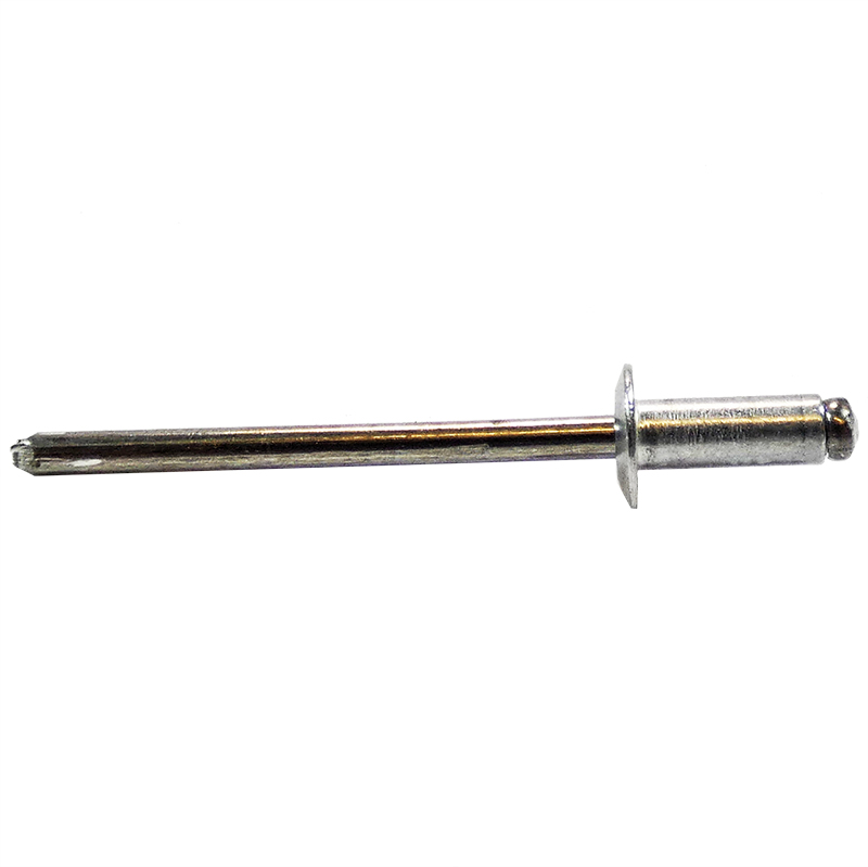 P60476 Aluminum Rivet - Aluminum Mandrel. 1/8 diameter x 1/4 head x 1/8 x 3/8 range. Blind open end pop rivets are available in a variety of sizes, types, and materials to fit most any application. Simple three step riveting make quick work of most any fastening job. These open end rivets resemble conventional tubular rivets when set, but retain the mandrel within the rivet body for added strength. |