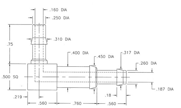 Bushed 90° tank fitting with standard 1/4" barb outlet and 1/4" barb in the tank Requires Rubber Bushing PN 05-01039 |