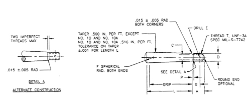 Manufactured from alloy steel, minimum tensile strength 125,000 PSI. Cadmium plated. Taper: 0.500"/ft. Use with AN975 taper pin washer, AN320 shear castle nut and cotter pin or with AN364 elastic stop nut. When installed, the small end of the tapered shank should protrude no more than 1/16" above the surface of the assembly. The first dash number is the Brown & Sharpe taper pin reamer number and the second dash number is the grip length in eighths of an inch. For undrilled threaded shank add the letter "A" after second dash number. To order taper reamers, please click here. |