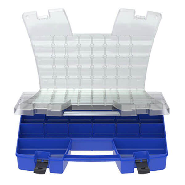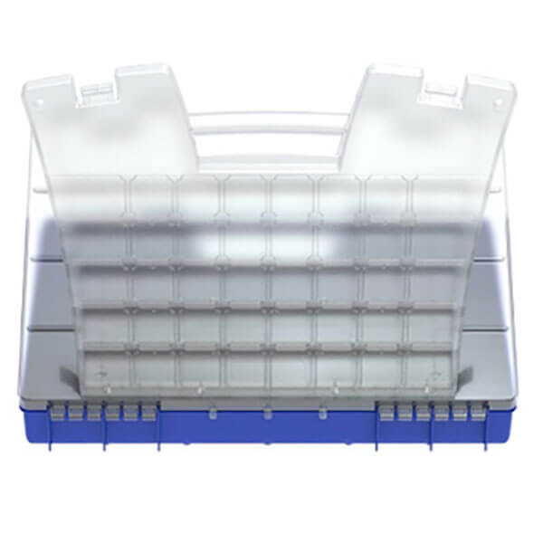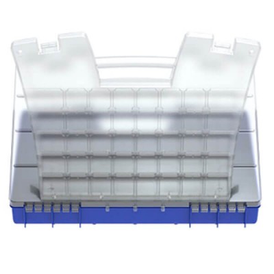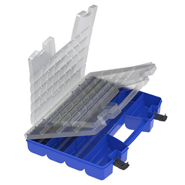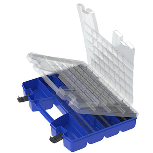 Portable Organizers are the perfect storage container for keeping small parts, tools and supplies neatly organized and easily accessible. Two separate compartments, each with dividers. The base is ideal for storing screwdrivers, wire connectors, hobby supplies, etc. Clear lid compartment provides visible storage for screws, tacks, nuts, washers, buttons, jewelry findings and a more. Dividers are countersunk with dovetail ends – no parts migration! Lid fastens securely for easy transport. Up to 62 individual storage compartments. |