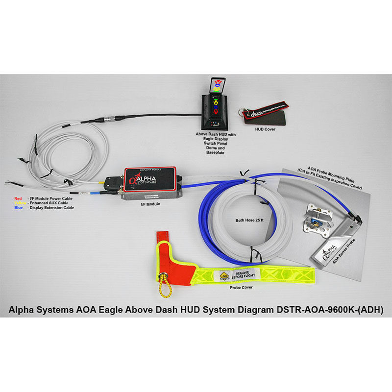 The Eagle Above Dash HUD pressurized AOA kit was designed and comes complete with most parts to mount the AOA sense probe, connection hoses and AOA sensor module outside of the pressure bulkhead. The AOA sensor connects through to the inside cockpit through unused pins on an existing pass-through connector. Connections on the inside of the aircraft connect the signals to the display interface module for power, audio, and display connections. Our systems are designed for simple installation and pilot flown calibration for real time, instantaneous full-scale AOA range. The Above Dash HUD kit sits on top of the Eagle display, showing the display segments in the HUD glass. The Eagle Above Dash HUD kit comes complete with interface computer, prewired cable/connector harnesses, tubing, cut to fit AOA probe mounting plate, hardware, switch panel, and flush mount HUD mounting brackets for installation in any aircraft. Our systems are designed for simple installation and pilot flown calibration for real time, instantaneous full-scale AOA range. The Eagle display is a highly visible, full color, chevron style display. With the chevron display, when you come in for a landing you want to fly to the blue donut (on speed for landing). Should you come in with too low of an angle of attack, the yellow chevron will light up and tell you to put your nose up. Should you come in with too high of an angle of attack, the red chevron will light up and tell you nose down. ABOVE DASH HUD FEATURES The HUD is a self contained adjustable beam splitter adapter that mounts to the lip of the Eagle display and turns the Alpha System AOA into a true HUD. Intended for placement directly within the pilot's peripheral vision. Allows for instantaneous viewing of AOA information exactly where needed. The HUD glass is an enhanced color correcting, anti-glare lens. Comes complete with mounting frame, base adaptor plate, dome, display brackets and hardware. |