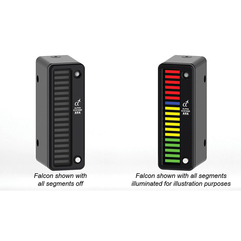| The Falcon kit has a vertical light bar style display. With the vertical light bar display, when you come in for a landing you want to fly to the blue LED (on speed for landing). Should you come in with too low of an angle of attack, the display will illuminate into the yellow, telling you to put your nose up. Should you come in with too high of an angle of attack, the display will illuminate red, telling you to put your nose down. |