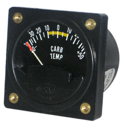 -50°C to 50°C, Provides instant icing check of carburetor. 8/30 vdc, yellow arc -10C to +10C, For use with 399W sender. 2" Round: 2C3-1 2-1/4" Square: 2A3-1 |