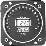 M-1 is a precision manifold pressure instrument featuring a 210 degree graphic analog display and a digital display. Measures absolute pressure in engine's manifold to .1" of mercury on the digital display. Enables pilot to make pre- cise throttle adjustment for max. performance during take- off, climb, and cruise. M-1 is easily installed by connecting to the aircraft's existing line through a 1/4" flare union in back of unit. Backlit and operates on 12 or 24V. Wt.: 13oz.