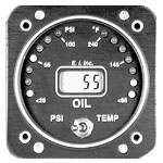 The OPT-1 is a dual instrument which features dual 90º graphic analog displays. Select to view pressure or temp. on the digital display using the toggle switch on the front panel. OTP-1 measure to 1 PSI and oil temp. to 1 F on the digital display. Incorporates an external pressure transduc- er and temperature probe that are mounted in the engine compartment. Instrument is backlit for night operation and operates on 12 or 24V system. Oil pressure range is 25-100 PSI and oil temp. range is 65°-240°F. Wt. 22 Oz.