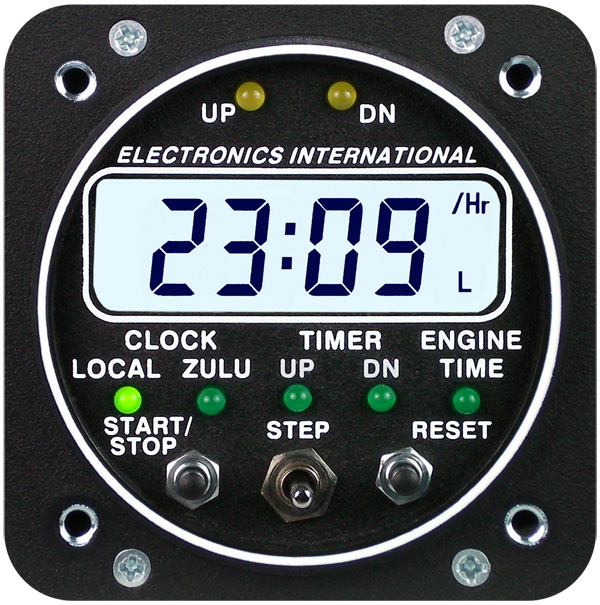 May be set to display in a 12 or 24-hour format. Displays Zulu Time. A 10-year lithium battery keeps the clock running even if the aircraft battery is removed. Displays an Up Timer. This Timer will start running when the engine is started. In this manner the Timer acts as an automatic Flight Timer. The Up Timer may be started, stopped or reset. A Recurring Alarm may be set to alert you at appropriate time intervals. Example: If the alarm is set for 30 minutes, you will get an alarm at 30 minutes, 60 minutes, 90 minutes, etc. This alarm can be used to remind you to check your fuel level or switch tanks at set time intervals. Displays a Down Timer. This Timer counts down from a programmed start time. The Down Timer may be started, stopped or reset. Warning lights above the LCD display will blink if the Up or the Down Timer times out. Displays an Engine Timer. This Timer acts as a Hobbs Meter. When the engine starts, the Engine Timer will run. The Engine Timer displays total engine time in hours, tenths and hundredths of an hour. E.I. products include all documentation and certifications |