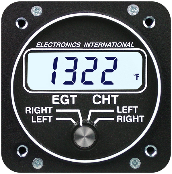 The line of Electronics International digital instruments offers precise readings at exceptional prices. All gauges are accurate to 1% and are FAA-approved under STC No.1626NM. Furnished complete with all probes and leads. EC-2: Left and Right EGT and Left and Right CHT for twin engine aircraft, 2 1/4" Mount, 2.5" Depth, 2.5 Lb. Kit, STCd, TSOd, PMAd, 1F Resolution, Accuracy: 1/2%, Viewable in direct sunlight, Backlit, Operates from 7.5 to 35 volts at .1 amp. Package Includes: Unit, 4 ea. 20 Cables, 2 ea. EGT Probes, 2 ea CHT Probes. (Screw-in P-100 CHT Probes, unless otherwise specified). |