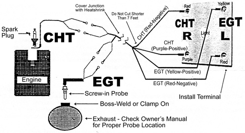 Superior to any other type of pyrometer available. This gauge is suitable for use on sport aircraft. It is constructed with a heavy duty, vibration and shock proof precision jeweled mechanism. Unlike other brands, these units are temperature compensated. That is, changes in ambient air temperature will not affect the gauge display. This gauge, when installed as instructed, will perform within 2% of accuracy. Like other Micro1000 gauges, these units come with our standard 2-year warranty. Order gauges, probes, and extension leads separately. Scaled 0-1700° F Requirements EGT Probe Options (requires one of): EP131, EP130, EP130R, EP132 or EP133 CHT Probe Options (requires one of): CP130, CP131, or CP132 Leads for the probes listed above are sold separately. EGT LEAD (requires one of either): EPE130.07 or EPE130.15 CHT LEAD (requires one of either): CPE130.07 or CPE130.15 Click here for more info on Micro-1000 Probes Gauge Installation The gauge should be mounted in the panel. Round gauges from the front are secured with a U-clamp in the rear. Square gauges from the rear are secured by four provided brass instrument screws and nylock nuts. Connections to Gauge You must use the Micro-1000 extension lead. This is the thermocouple lead and cannot be substituted with normal electrical wire. Fifteen foot extension can be shortened down to a minimum of 7 feet. Seven foot leads may not be shortened. If you have excess leads then bundle and secure them with cable ties or other save method. Wire the backlight if desired or leave unconnected. Connect the probe leads to the instrument as shown in the illustration below. Connect the extension lead to the probe leads matching to the corresponding colors. Red to red, purple to purple, and yellow to yellow. EGT leads connect the "L" terminals on the gauge. Yellow wire goes to the + positive terminal and red lead connects to the - negative terminal. CHT leads connect to the "R" terminals on the gauge. The red lead connects to the positive terminal and the purple lead connects to the - negative terminal. |