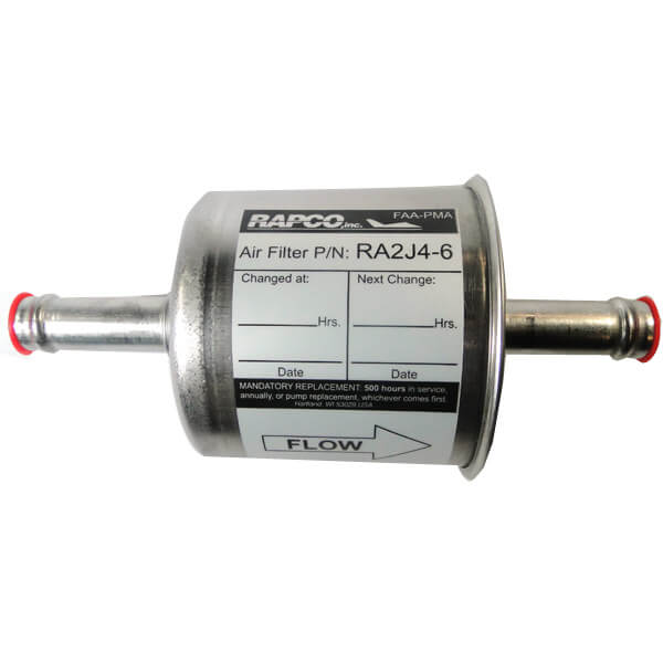 Rapco RA2J4-6 Inline Air Filter. Sealed Stainless Steel canister filter with two 5/8” hose fittings, overall length 6” x 3-1/4” diameter.