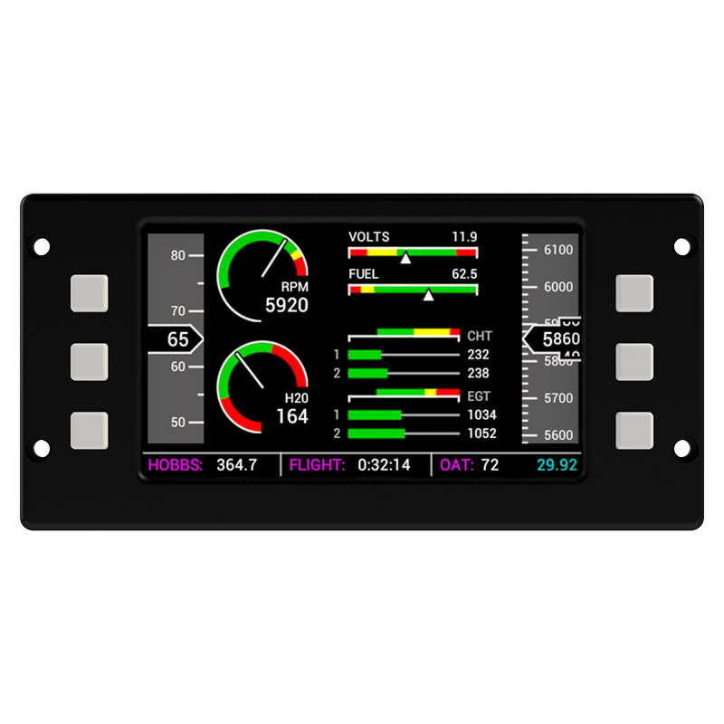 Designed for 2-stroke engines including the Rotax and Hirth product lines. Wapsi Aero is excited to introduce a new affordable engine monitoring solution to the ultralight and light-sport markets. This instrument provides the features found in modern glass-panels at a fraction of the cost. All engine parameters are displayed on a single page to allow for quick assessment of engine health without flipping through menus. The clearly-marked ranges help the pilot quickly verify that the engine is operating within its normal limits and on-screen alarms indicate when these limits have been exceeded. The display also includes integrated airspeed and altitude indicators, making it a one-stop instrumentation solution for space-limited installations. |