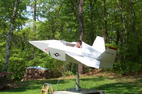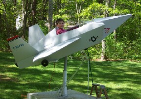 The new AQUAJET X, designed by Don James, and inspired by forthcoming warbirds F22 Raptor and X35 Joint Strike Fighter, provides the next level of flying excitement and realism between the AquaJet and a real airplane. To provide vectored thrust via rudder pedals while creating the jet engine sound you can add an electric leaf blower (electric leaf blower is not included with the kit). Also there is a more sophisticated suspension system. Thus, the Aquajet X can climb at 30 deg., dive at 15 deg., bank, turn and spin up to three revolutions under full control of the pilot. A throttle actuates the lift cylinder - controlling takeoff, climb and descent so the stick can control pitch and landing flare. *Note: The Aqua Jet kit list includes all of the parts we can provide. Other items are required to build the Aqua Jet and many of them can be sourced at hardware stores and building centers. click here to go to the website for AquaJet-X. |