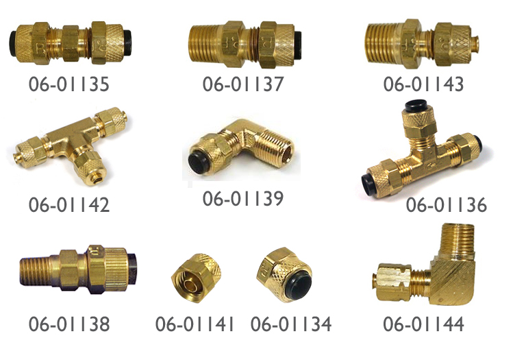 Matco brake tubes, brass fittings, straight fittings, elbow fittings, T-fittings, ferrules, & nuts. |