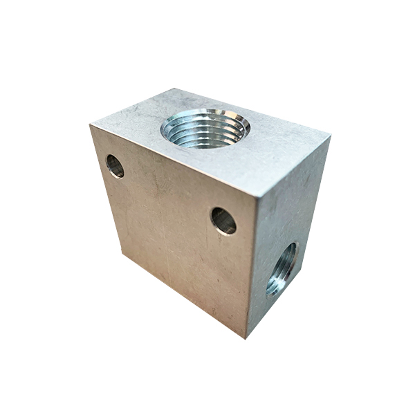 -1: One port in the end with two ports out, 90° cross drilled with one port per side. 3 ports total. Two Mounting Holes.