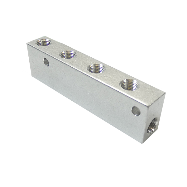 Our aluminum manifold fittings are a bolt-on design with taper pipe threads. These fittings are designed to provide a convenient means of plumbing multiple hoses from and/or to one source with the fitting being bolted to a supporting structure. This design will eliminate Adel clamps at the juncture of the hoses and eliminate additional tee type fittings when more than two hoses are to be connected to one source. Applications include brake reservoir lines, static system, suction systems, fuel systems, air line pigs, smoke systems, and more. Not for use on oxygen systems or pressures over 150 psi. Basic part number on all fittings is 04-00XXX, complete the part number by filling in the last 3 digits after selecting the fitting you need according to the details below. Example: 04 -00102. First Code Number - Determines the style of the fitting. -1: One port in the end with two ports out, 90° cross drilled with one port per side. 3 ports total. Two Mounting Holes. -2: One port in the end with four ports out, 90° cross drilled with two ports per side. 5 ports total. Two Mounting Holes. -3: One port in the end with six ports out, 90° cross drilled with three ports per side. 7 ports total. Four Mounting Holes. -4: One port in the end with eight ports out, 90° cross drilled with four ports per side. 9 ports total. Four Mounting Holes. -5: One port in the end with four ports out, 90° drilling with four ports on one side only. 5 ports total. Two Mounting Holes. Second Code Number - Determines the style of porting. -0: All the ports are the same. -1: Inlet port is one size larger than outlet ports. -2: Inlet port is two sizes larger than outlet ports. Third Code Number - Determines the inlet port size. -2: 1/8-27 taper pipe thread (NPT) -4: 1/4-18 taper pipe thread (NPT) -6: 3/8-18 taper pipe thread (NPT) -8: 1/2-14 taper pipe thread (NPT) In the example above - 04 -00102, this would be a 1/8 NPT inlet with two outlets of the same size. Example - 04 -00326, this would have a 3/8 NPT inlet with six 1/8 NPT outlets. |