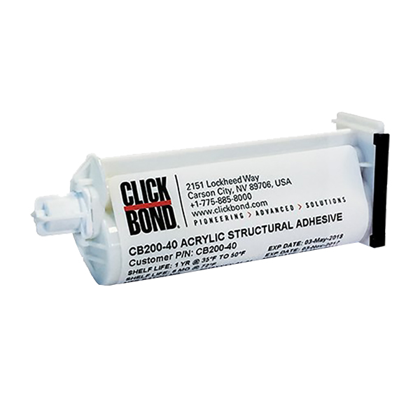 | CB200 acrylic structural adhesive is a two part thixotropic paste adhesive capable of bonding a wide variety of metals, engineering thermoplastics, and composites. CB200 cures quickly at room temperature and exhibits excellent environmental and chemical resistance. CB200 adhesive replaces welding, riveting, and other mechanical fastening methods. CB200 is packaged in an 8:1 cartridge and is recommended for installation of Click Bond adhesive bonded fasteners. |
