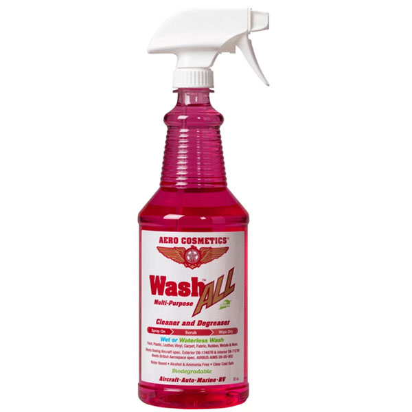 Wash ALL is a biodegradable cleaner and degreaser used for those tough, greasy, oily, and grimy cleaning jobs such as aircraft engine areas, landing gear, bellies, and black streaks on RV`s and airplanes, car wheels, tires, boat transom, and water lines. Removes dirt without scratching. Simply spray on and wipe dry. Works on all surfaces such as paint, glass, plastic, leather, vinyl, rubber, wood, gel coat, aluminum, and other hard surfaces.