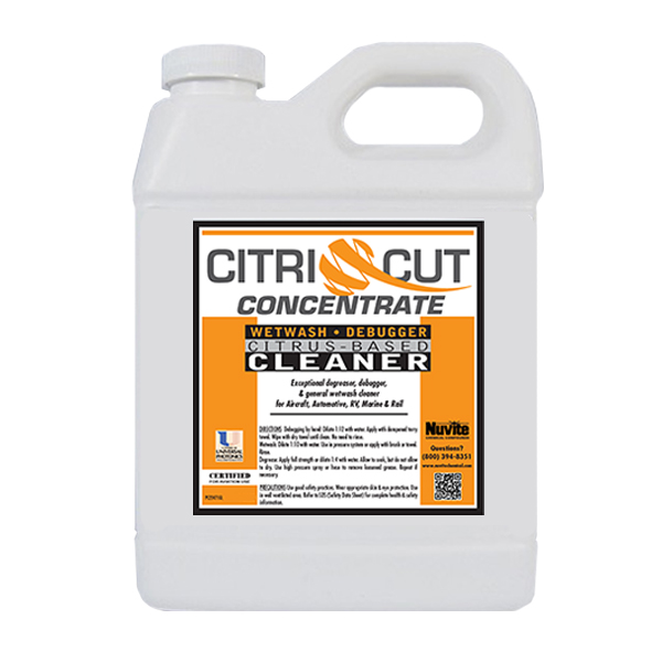 | NuVite CitriCut is a citrus based airframe wetwash and wipedown cleaner. Pleasant citrus smelling wet wash or wipe down cleaner that is especially friendly to the environment. Works great for standard wet washing with mops or scrub pads. When used as a wet wash, water sheets off, minimizing water spotting. CitriCut is also handy for hand debugging or hand wipe down without need for rinse -so there is no need for water or floor cleanup. Spray CitriCut at 1:8 from hand trigger sprayer for hand debugging or wipedown and wipe with terry towel until clean. Use a clean towel to buff up surface shine. No need to rinse surface. Supplied as concentrate—use 1:8 for hand wipe down or 1:16 in wet wash water. |