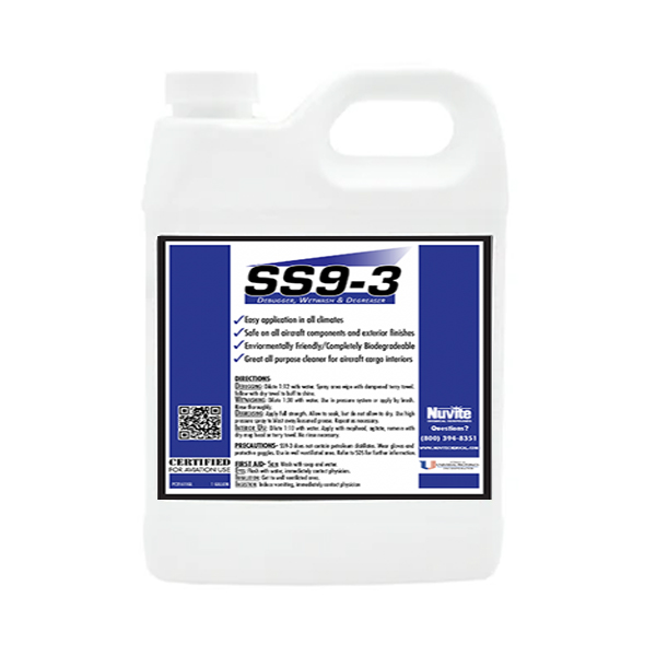 Nuvite SS-9-3 is the championship-caliber answer to the need for an effective and safe all-purpose liquid alkaline cleaner. It will clean the toughest of underbelly grease, oils and fluid leakage at full strength, or can be diluted to 1:12 to make an easy-to-use debugger and whole-airframe wipedown fluid that leaves a beautiful squeaky-clean and shiny surface that does not need to be rinsed. It works great for in-place cleaning during other airframe or engine maintenance. And, if you want to wet wash, use it in your wash water at 1:20 to make a great, non-streaking or spotting cleaner. It can even be used to clean interiors of cargo or utility aircraft. SS-9-3 is a superb product that offers great efficiency and economy due to wide usage capability and being supplied in high concentration form. And, as a bonus, it is completely biodegradable and safe to use. |