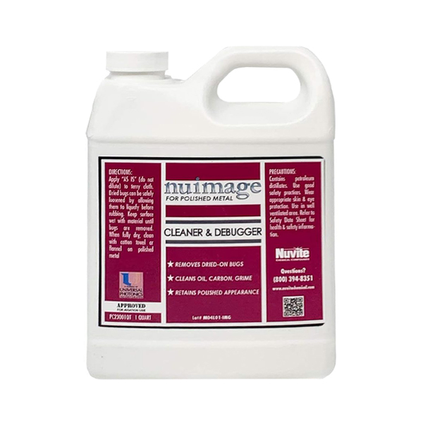 Nuvite NuImage is the answer to debugging and oil removal problems on your show-quality brightwork! NuImage will clean and debug your outstanding polish job without the fogging of normal cleaners, and will save you time and effort while it helps you maintain that famous "Nuvite Look" you get with Nuvite NuShine II metal polishes! NuImage works great for cleaning polished skins on aircraft bellies and cowlings, removing oils and fluids without the rainbow effect that are usually left on the surface from oil residue. And, it's easy, to put NuImage on a soft cotton flannel rag and apply, wetting bug spots, rubbing gently and spreading over the surface until clean. Continue over the surface, and when complete, final buff away the slight, dried haze to reveal the beautiful clear shine. Nuvite NuImage even works great as a final cleanup for black metal polish residue on paint, and will help remove excess polish after power buffing. NuImage: the ANSWER to polished metal cleaning & upkeep! |