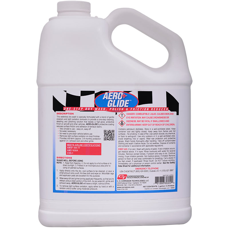 Aero-Glide One-Step Dry Wash, Polish & Friction Reducer This waterless dry wash is specially formulated with a blend of deep cleaners and light oxidation removers to provide a true one-step cleaning, detailing and polishing solution that leaves a high gloss protective finish on aircraft and other vehicles. Aero-Glide's hard protective coating reduces surface friction and exhaust stains. Aero-Glide is very simple to use. Apply either directly onto the surface to be cleaned or pour a small amount onto a cloth and wipe on. Any soft, lint free cloth will work fine. Microfiber rags or applicator pads are excellent for this purpose. Wipe away dirt and grime. Turn applicator frequently, so that you're always using a clean portion of the cloth. For light surface oxidation, apply either by hand or with a random orbital buffer using moderate pressure. As you wipe away dirt, grime and exhaust away, Aero-Glide will leave a bright lustrous brilliant shine |