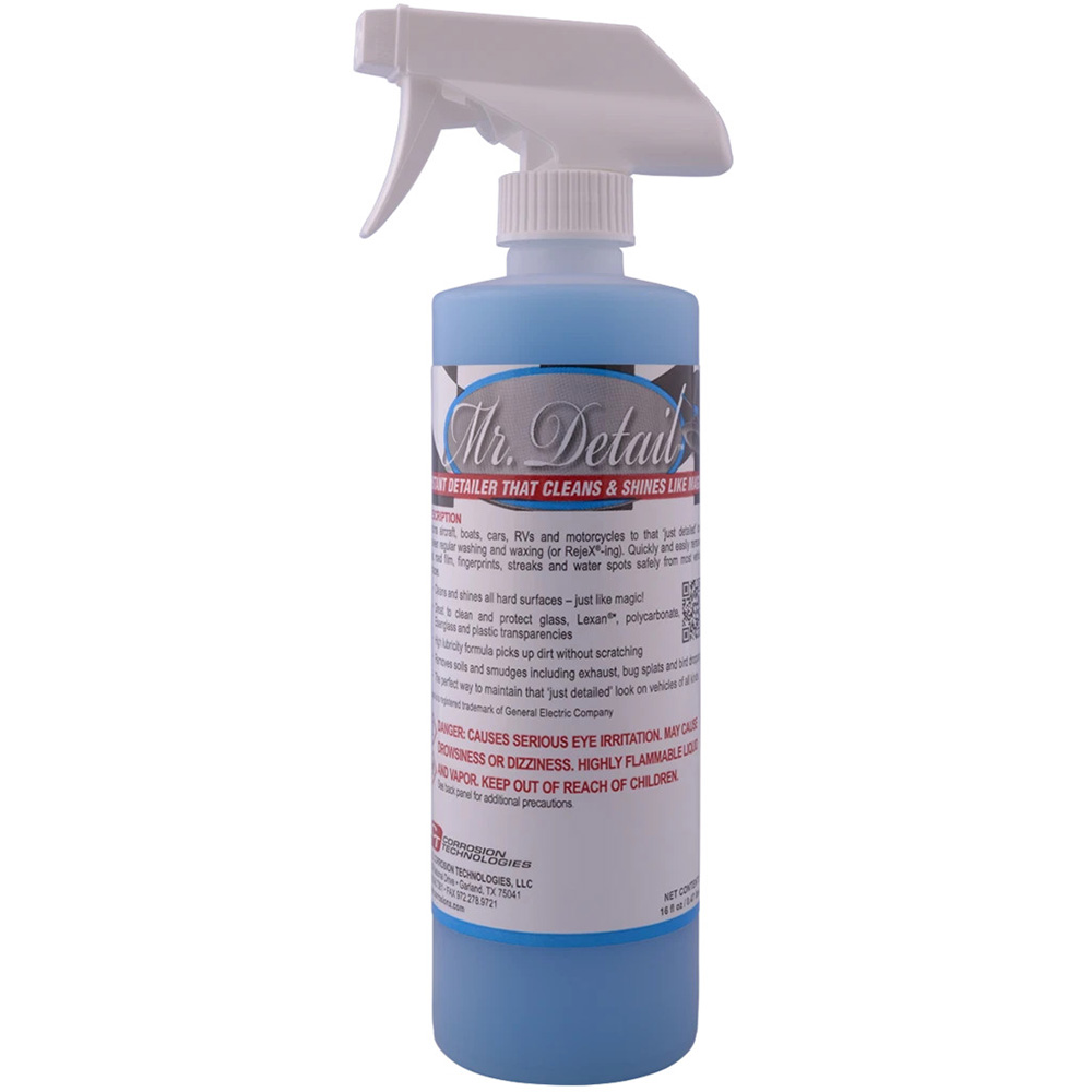 Mr. Detail The instant detailer that cleans and shines like magic. Mr. Detail returns aircraft, boats, cars, RVs and motorcycles to that 'just detailed' look between regular washing and waxing (or RejeX-ing). Quickly and easily removes dust, road film, fingerprints, streaks and water spots safely from most vehicle surfaces. Make sure surface to be treated is cool to the touch. Mist Mr. Detail onto a small area (approximately 1-8 square feet). With a clean, soft cloth (any soft, lint-free cloth will do – microfiber, terry cloth or cotton 'baby diaper' material are all excellent for this purpose), light wipe treated area. When wiping, Mr. Detail will remove dust, fingerprints and other grime, so it is important to keep turning the cloth so as to always expose a clean cloth surface to the area being treated. Continue wiping until area is clean and shiny, and Mr. Detail is absorbed into the cloth. Do not allow excess product to dry on the vehicle. |