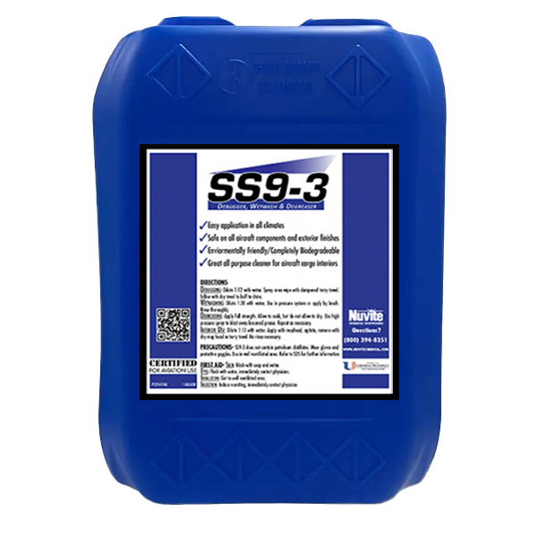Nuvite SS-9-3 is the championship-caliber answer to the need for an effective and safe all-purpose liquid alkaline cleaner. It will clean the toughest of underbelly grease, oils and fluid leakage at full strength, or can be diluted to 1:12 to make an easy-to-use debugger and whole-airframe wipedown fluid that leaves a beautiful squeaky-clean and shiny surface that does not need to be rinsed. It works great for in-place cleaning during other airframe or engine maintenance. And, if you want to wet wash, use it in your wash water at 1:20 to make a great, non-streaking or spotting cleaner. It can even be used to clean interiors of cargo or utility aircraft. SS-9-3 is a superb product that offers great efficiency and economy due to wide usage capability and being supplied in high concentration form. And, as a bonus, it is completely biodegradable and safe to use. |