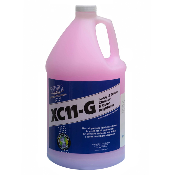 | Spray & Shine is an exterior, light duty cleaner. This pink liquid is a spray on, wipe off formula to clean, enhance and maintain painted surfaces and brightwork. It is recommended for removing bugs, smudges, spotting and light carbon buildup on exterior surfaces. This product is highly recommended for post flight wipe down of leading edge and engine inlet debris. Leave on as a film during coastal or tropical parking to preserve brightwork treated with Xzilon 3. It is also used as a lubricant/cleaner when micro-polishing paint with Grana-Clay Bars. Safe for use on Xzilon 3 coated aircraft. See XC11CL-Q on page 11 for interior use. Available in gallon, 5 gallon and 55 gallon containers. Aviation Industry Certified. |
