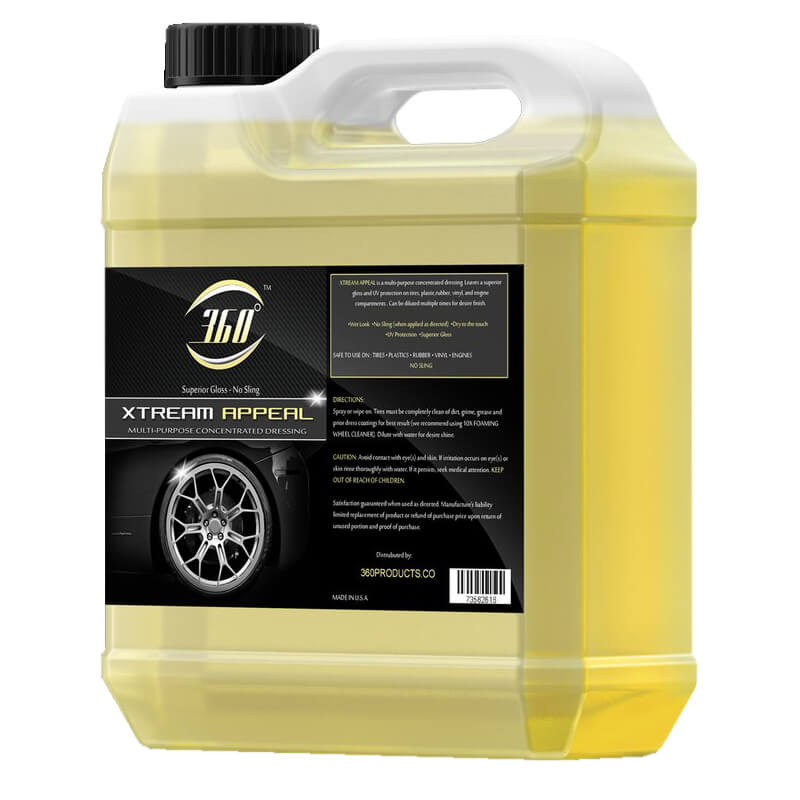 Xtream Appeal is high gloss multi-purpose dressing that could be used on tires, plastic, leather, vinyl and rubber, such as interior and engine compartments. In order for a better finish, all surfaces must be completely clean of dirt, grime, grease, and prior dress coatings. This product dries to the touch while it sill gives a long-lasting shine. Xtream Appeal can be diluted multiple times for desired finish. Fast and Easy To Use. Very easy to use and safe on tires, plastics, rubber, vinyl and engine. Just spray or wipe on the surface you want to bring back the gloss. Get Results You Are Use To Get the results that you are used to getting when you use 360 products. You will get good results. |