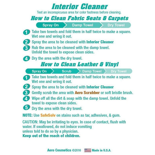 | Interior Cleaner cleans and removes beverage spills and stains from Aircraft, Car, Boat, and RV carpets, seats, tray tables, side panels, cockpits, and galleys. Works well with the Aero Scrubber. |