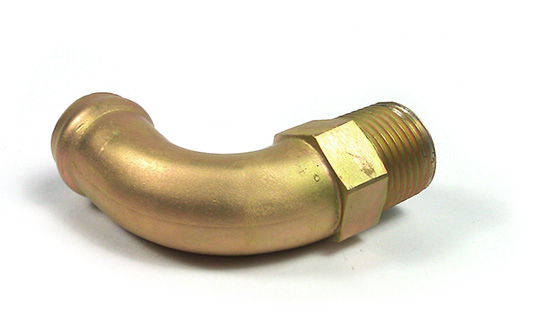 A 3/8" 90° short high-flow fitting used for either inlet or outlets with installations having 5/8" hoses. |
