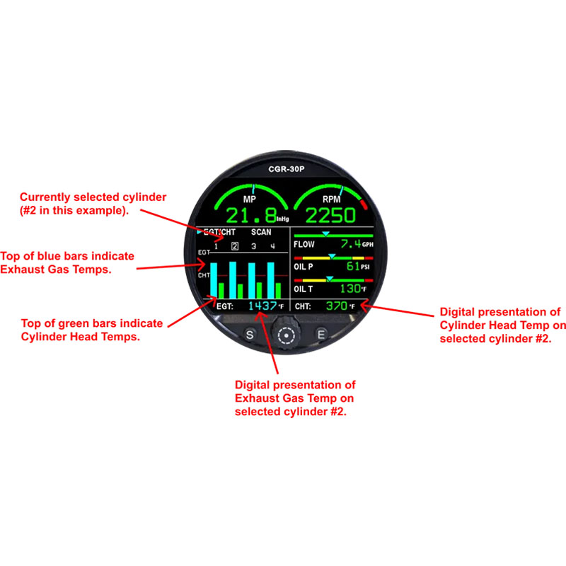 • The CGR-30P Premium Engine Monitor’s Main Screen displays the Tachometer and Fuel Flow in large analog arcs at the top of the instrument, providing immediate and quick reference values. The digital display provides accuracy in monitoring engine functions. The CGR Main Screen also features a complete, primary replacement EGT/CHT Bar Graph Engine Analyzer. Each cylinder is monitored by the CGR. If any EGT or CHT temperature rises above or below-programmed limits, the CGR provides an immediate alert. The EGT/CHT Bar Graph Analyzer features both Lean-of-Peak and Rich-of-Peak Modes for easy engine leaning. The CGR-30P will let you know as each cylinder peaks, at what temperature each cylinder peaks, and how far below Peak Temperature each cylinder is operating. To the right of the EGT/CHT Bar Graph Analyzer, the CGR-30P displays Fuel Remaining, Volts, and OAT.