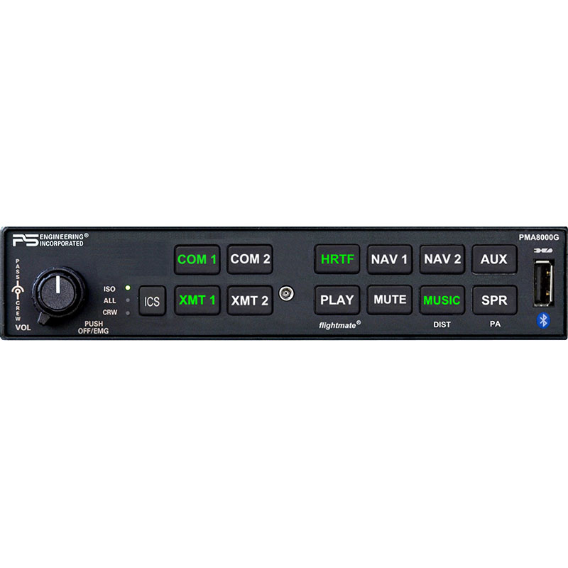The PMA8000G marks a major milestone in the company’s innovative history. Third generation user interface along with advanced digital processing, makes this a perfect fit for pilots who expect more from their audio panel while not wanting complexity. The PMA8000G is a natural choice for pilots who demand ease of use with a deep set of audio panel capabilities. Introducing flightmate®, the first multi-function digital recorder/audio system available in an audio selector panel. Functions such as creating 4 aural alerts, creating checklists, and an instant aircraft radio playback are all part of this emergency procedures, just about anything that pilot can say, they can store into non-volatile memory, making those checklist chores a bit easier. flightmate® also allows the creation of aural alert that are programmed by the pilot using a few front panel key presses while speaking into the pilot’s microphone. This records these annunciations in locations that are specific to one of the four discrete inputs of the audio panel. Anytime there is a change of state (a out of limit condition or a Sonalert starts to sound off) the associated message will sound out until it is acknowledged. One of the four discrete messages is designed specifically for Sonalerts, the other three are for logic levels, typically coming from electronic engine instruments or other devices that give a change of state during a pre-set condition. IntelliAudio® is another standard capability that will make listening to multiple radio calls manageable. With Com 1 in the 10 O’clock position and Com 2 in the 2 O’clock position, pilots can pay attention to the radio that is most important at any one instant of time. Bluetooth® interconnectivity allows the pilot to have access to their Bluetooth® enabled telephone or entertainment device. The ability to contact ATC by way of the telephone with the engines running and radios tuned and set at an uncontrolled airfield makes getting into the air under IFR condition much easier. And like all of our PMA8000 series, there are front panel configuration that allows both the pilot and copilot to configure the intercom to best suite the needs of the cockpit crew and passengers. We have also included a USB charging port that is rated at 10 watts. This charger provides enough power for iPads that are running the most demanding application. We also took a fresh approach to the user interface, making access to the advance functions much easier than in past iterations of the PMA8000 series.