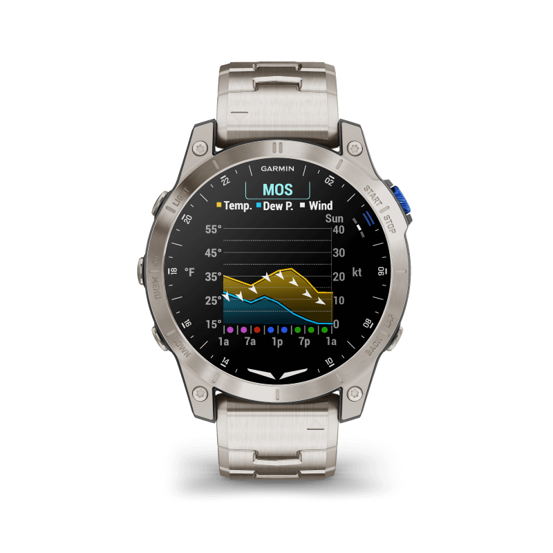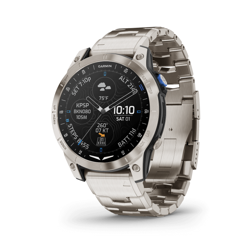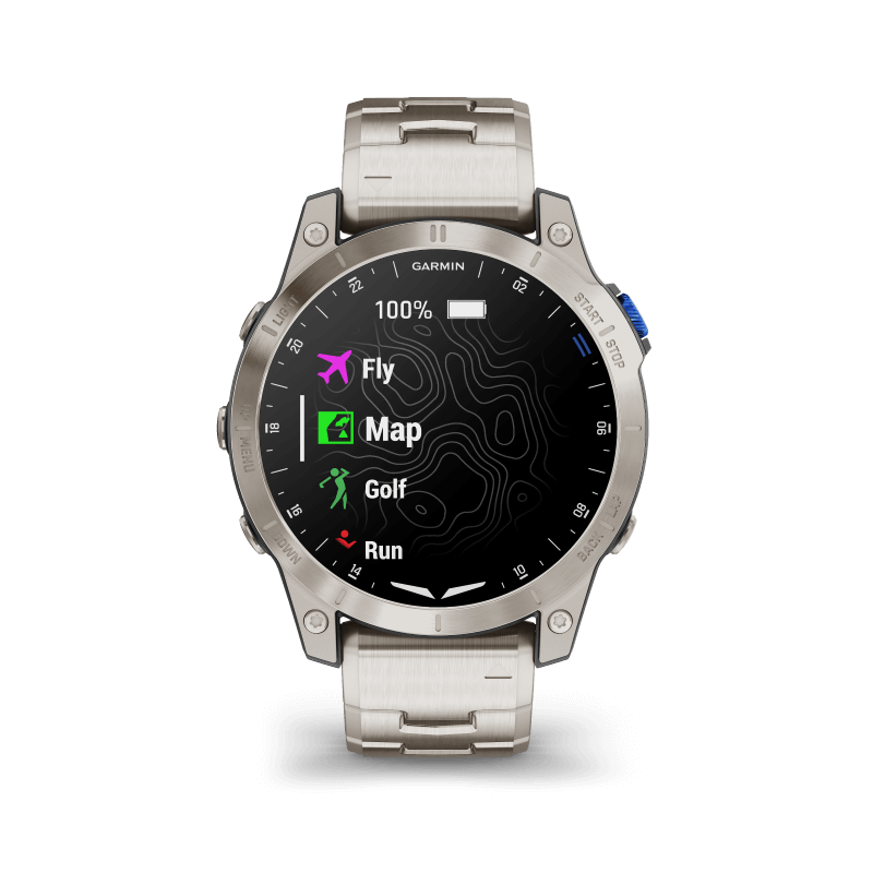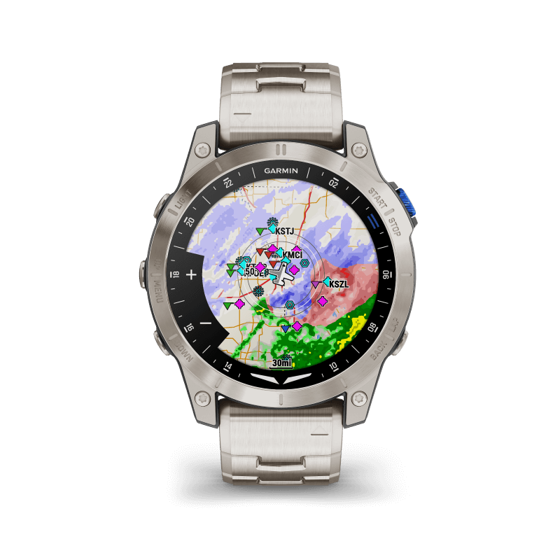 | With classic style and a modern AMOLED touchscreen display, this premium smartwatch offers advanced tools for flying — plus health and fitness features that enhance your pilot life.  CREATED FOR YOUR LIFESTYLE TOUCHSCREEN AND BUTTONS PREMIUM MATERIALS     DIRECT-TO NAVIGATION   MOVING MAP   WEATHER REPORTS   METEOGRAM FEATURE   HSI COURSE NEEDLE   PULSE OX SENSOR   AIRPORT INFORMATION   BAROMETRIC ALTIMETER    FLIGHT LOGGING   EMERGENCY MODE   CONFIGURABLE ALERTS   ALERTS AND TIMERS   UTC AND TIME ZONES   FLIGHT PLAN TRANSFER   SUNRISE/SUNSET WIDGET    HEALTH SNAPSHOT™ FEATURE   BODY BATTERY™ ENERGY MONITORING   WRIST-BASED HEART RATE   STRESS TRACKING   SLEEP SCORE AND ADVANCED SLEEP MONITORING   RESPIRATION TRACKING   HYDRATION TRACKING    SPORTS APPS   ANIMATED WORKOUTS   PERFORMANCE METRICS   DAILY WORKOUT SUGGESTIONS   GARMIN COACH   REAL-TIME STAMINA    MULTI-GNSS SUPPORT   MULTI-BAND FREQUENCY SUPPORT   INREACH® DEVICE CONNECTIVITY   TACTICAL FEATURES   DUAL-GRID COORDINATES   RUGGED CONSTRUCTION   ABC SENSORS   MULTICONTINENT TOPO MAPS   GOLF COURSES    SMART NOTIFICATIONS   MUSIC APPS   GARMIN PAY™ CONTACTLESS PAYMENTS   CONNECT IQ™ STORE   POWER MANAGER   BATTERY LIFE 1When paired with a compatible smartphone, with a data connection, and in range of BLUETOOTH® technology 2Only available for U.S. airports. 3This is not a medical device and is not intended for use in the diagnosis or monitoring of any medical condition; see Garmin.com/ataccuracy. Pulse Ox not available in all countries. 4Activity tracking accuracy 5Active subscription required. Some jurisdictions regulate or prohibit the use of satellite communications devices. It is the responsibility of the user to know and follow all applicable laws in the jurisdictions where the device is intended to be used. Wi-Fi is a registered trademark of the Wi-Fi Alliance. SPOTIFY and the Spotify logo are among the registered trademarks of Spotify AB. Amazon Music and all related logos are trademarks of Amazon.com, Inc. or its affiliates. The Bluetooth word mark and logos are registered trademarks owned by Bluetooth SIG, Inc. and any use of such marks by Garmin is under license. |