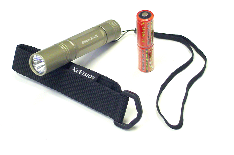 The XV-C2C features six settings, 4 of them being output levels. This flexibility not only allows the user to select the best compromise between brightness and runtime for any given task but also has the ability to aid in an emergency. The XV-C2C offers a remarkably compact size and is extremely solid and reliable with its digitally regulated brightness. Two 3 VDC CR123A batteries (Lithium), not rechargeable. |