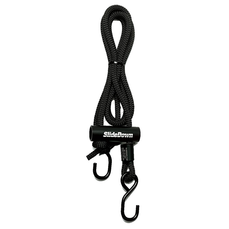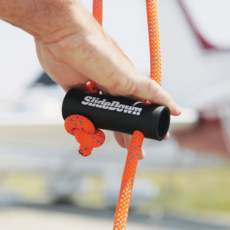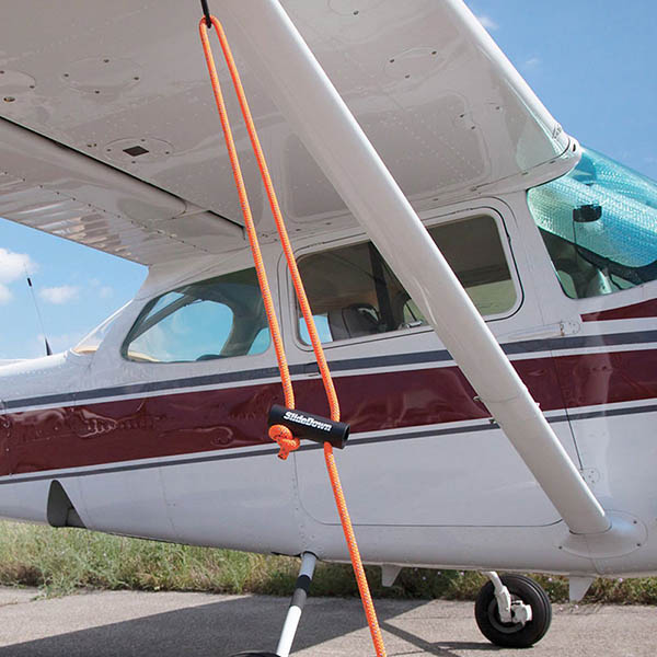 There is a fast and easy way to secure your aircraft. Developed by a pilot for pilots, the SlideDown is an exceptional new product for securing your aircraft to the ground anchors. No more complicated knots, just attach one end to the ground anchor and the other to your aircraft, pull down on the slide and your done! It’s that simple. SlideDowns are sold as a set of three, one for each wing and a tail along with a nylon carry bag to stow your set. The 7/16” kernmantle braided rope is a balanced construction consisting of a continuous filament polyester cover braided over a unidirectional nylon core and is used primarily in the safety and rescue industry. The precision drilled powder coated slide, made from 6061aircraft grade aluminum, allows for easy sliding and a tight hold. The vinyl coated hooks prevent any scratching to the aircraft contact points. Made as a “one size fits most aircraft”, the SlideDown is easily adjustable to reach most anchor points. Maximum reach on the wings are approximately 100 inches and the maximum reach on the tail is approximately 54 inches. The SlideDown can be shortened to accommodate just about any length. The SlideDown is proudly Made in the USA and available in a variety of colors. Sold in set of 3 |