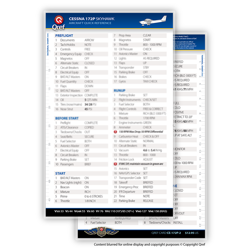 Qref BooksTopics Covered: Preflight, Takeoff/Cruise, Landing, Comprehensive Abnormals and Emergencies, V-speed list, cruise performance chart Get the most accurate, reliable aircraft checklist on the market with a Qref checklist. The procedures cover every aspect of flight, from preflight through takeoff, cruise, landing, and a comprehensive emergencies/abnormals section. Emergencies are arranged by system, meaning no more digging through pages to find the right section. Qref’s trademark is creating checklists that are easy for pilots to use. A major difference in aircraft checklists between Qref and others is the level of experience and expertise that go into every procedure. The Qref team of Master CFIs have over four decades of combined active flight instruction and flying experience at all levels of industry, with instruction and flight time in this aircraft. Further, they have taken advantage of the past 20 years of checklist design research. Qref’s team incorporates industry-best practices into these checklists and forthcoming publications. They not only create checklists, they use them in daily instruction and flying. Qref checklist design features a larger, more readable font, comprehensive procedures sectioned into tabs loaded with useful reference and conversions, and non-glare laminated pages. A complete table of contents makes finding the exact procedure quick. Find out for yourself why Qref aircraft checklists are fast becoming the Gold Standard in aviation. Qref CardsTopics Covered: Preflight, Takeoff/Cruise, Landing, Abnormals and Emergencies, V-speed list 2-card set: one for standard procedures, one for abnormals and emergencies. Q'Cards are designed for pilots who are already familiar with the aircraft but need an everyday checklist to keep relevant procedures at their fingertips. 5" x 9" (12.7 cm x 22.8 cm), the prefect size to fit on a yoke mount or kneeboard. Indestructible proprietary 10-mil laminate with non-glare, UV protective treatment means these checklists will withstand years of use. No other checklist has this! A major difference in aircraft checklists between Qref and others is the level of experience and expertise that go into every procedure. The Qref team of Master CFIs have over four decades of combined active flight instruction and flying experience at all levels of industry, with instruction and flight time in this aircraft. Further, they have taken advantage of the past 20 years of checklist design research. Qref’s team incorporates industry-best practices into these checklists and forthcoming publications. They not only create checklists, they use them in daily instruction and flying. Find out for yourself why Qref aircraft checklists are fast becoming the Gold Standard in aviation. |