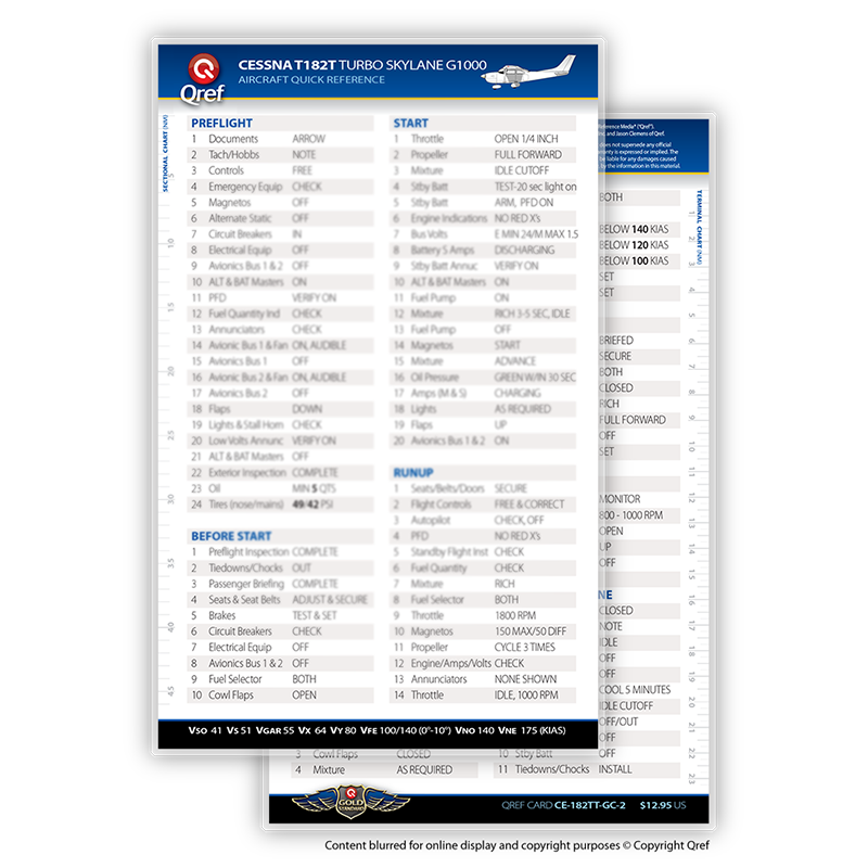 Qref BooksTopics Covered: Preflight, Takeoff/Cruise, Landing, Comprehensive Abnormals and Emergencies, V-speed list, cruise performance chart Get the most accurate, reliable aircraft checklist on the market with a Qref checklist. The procedures cover every aspect of flight, from preflight through takeoff, cruise, landing, and a comprehensive emergencies/abnormals section. Emergencies are arranged by system, meaning no more digging through pages to find the right section. Qref’s trademark is creating checklists that are easy for pilots to use. A major difference in aircraft checklists between Qref and others is the level of experience and expertise that go into every procedure. The Qref team of Master CFIs have over four decades of combined active flight instruction and flying experience at all levels of industry, with instruction and flight time in this aircraft. Further, they have taken advantage of the past 20 years of checklist design research. Qref’s team incorporates industry-best practices into these checklists and forthcoming publications. They not only create checklists, they use them in daily instruction and flying. Qref checklist design features a larger, more readable font, comprehensive procedures sectioned into tabs loaded with useful reference and conversions, and non-glare laminated pages. A complete table of contents makes finding the exact procedure quick. Find out for yourself why Qref aircraft checklists are fast becoming the Gold Standard in aviation. Qref CardsTopics Covered: Preflight, Takeoff/Cruise, Landing, Abnormals and Emergencies, V-speed list 2-card set: one for standard procedures, one for abnormals and emergencies. Q'Cards are designed for pilots who are already familiar with the aircraft but need an everyday checklist to keep relevant procedures at their fingertips. 5" x 9" (12.7 cm x 22.8 cm), the prefect size to fit on a yoke mount or kneeboard. Indestructible proprietary 10-mil laminate with non-glare, UV protective treatment means these checklists will withstand years of use. No other checklist has this! A major difference in aircraft checklists between Qref and others is the level of experience and expertise that go into every procedure. The Qref team of Master CFIs have over four decades of combined active flight instruction and flying experience at all levels of industry, with instruction and flight time in this aircraft. Further, they have taken advantage of the past 20 years of checklist design research. Qref’s team incorporates industry-best practices into these checklists and forthcoming publications. They not only create checklists, they use them in daily instruction and flying. Find out for yourself why Qref aircraft checklists are fast becoming the Gold Standard in aviation. |