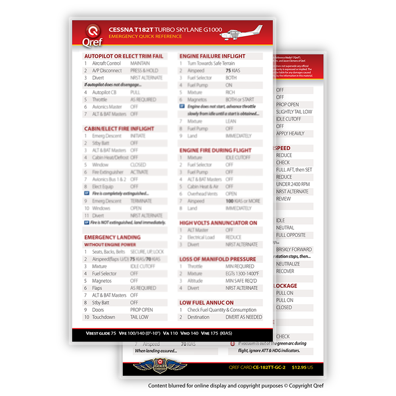 Qref BooksTopics Covered: Preflight, Takeoff/Cruise, Landing, Comprehensive Abnormals and Emergencies, V-speed list, cruise performance chart Get the most accurate, reliable aircraft checklist on the market with a Qref checklist. The procedures cover every aspect of flight, from preflight through takeoff, cruise, landing, and a comprehensive emergencies/abnormals section. Emergencies are arranged by system, meaning no more digging through pages to find the right section. Qref’s trademark is creating checklists that are easy for pilots to use. A major difference in aircraft checklists between Qref and others is the level of experience and expertise that go into every procedure. The Qref team of Master CFIs have over four decades of combined active flight instruction and flying experience at all levels of industry, with instruction and flight time in this aircraft. Further, they have taken advantage of the past 20 years of checklist design research. Qref’s team incorporates industry-best practices into these checklists and forthcoming publications. They not only create checklists, they use them in daily instruction and flying. Qref checklist design features a larger, more readable font, comprehensive procedures sectioned into tabs loaded with useful reference and conversions, and non-glare laminated pages. A complete table of contents makes finding the exact procedure quick. Find out for yourself why Qref aircraft checklists are fast becoming the Gold Standard in aviation. Qref CardsTopics Covered: Preflight, Takeoff/Cruise, Landing, Abnormals and Emergencies, V-speed list 2-card set: one for standard procedures, one for abnormals and emergencies. Q'Cards are designed for pilots who are already familiar with the aircraft but need an everyday checklist to keep relevant procedures at their fingertips. 5" x 9" (12.7 cm x 22.8 cm), the prefect size to fit on a yoke mount or kneeboard. Indestructible proprietary 10-mil laminate with non-glare, UV protective treatment means these checklists will withstand years of use. No other checklist has this! A major difference in aircraft checklists between Qref and others is the level of experience and expertise that go into every procedure. The Qref team of Master CFIs have over four decades of combined active flight instruction and flying experience at all levels of industry, with instruction and flight time in this aircraft. Further, they have taken advantage of the past 20 years of checklist design research. Qref’s team incorporates industry-best practices into these checklists and forthcoming publications. They not only create checklists, they use them in daily instruction and flying. Find out for yourself why Qref aircraft checklists are fast becoming the Gold Standard in aviation. |