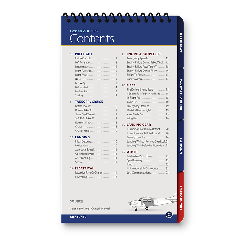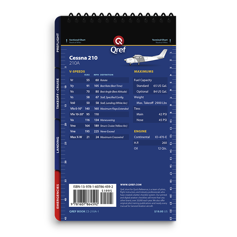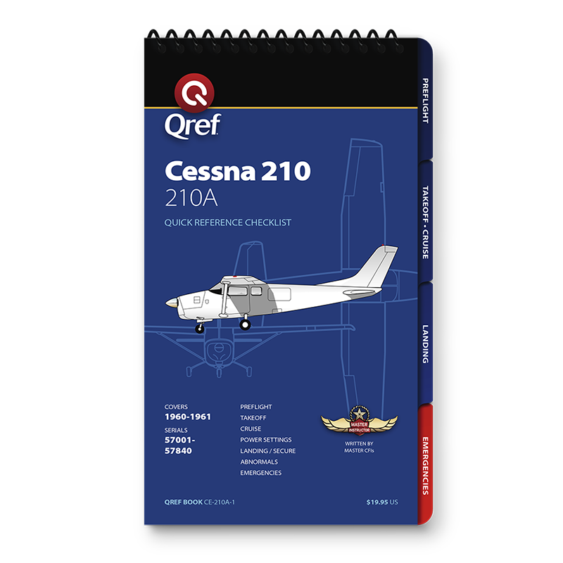 Qref BooksTopics Covered: Preflight, Takeoff/Cruise, Landing, Comprehensive Abnormals and Emergencies, V-speed list, cruise performance chart Get the most accurate, reliable aircraft checklist on the market with a Qref checklist. The procedures cover every aspect of flight, from preflight through takeoff, cruise, landing, and a comprehensive emergencies/abnormals section. Emergencies are arranged by system, meaning no more digging through pages to find the right section. Qref’s trademark is creating checklists that are easy for pilots to use. A major difference in aircraft checklists between Qref and others is the level of experience and expertise that go into every procedure. The Qref team of Master CFIs have over four decades of combined active flight instruction and flying experience at all levels of industry, with instruction and flight time in this aircraft. Further, they have taken advantage of the past 20 years of checklist design research. Qref’s team incorporates industry-best practices into these checklists and forthcoming publications. They not only create checklists, they use them in daily instruction and flying. Qref checklist design features a larger, more readable font, comprehensive procedures sectioned into tabs loaded with useful reference and conversions, and non-glare laminated pages. A complete table of contents makes finding the exact procedure quick. Find out for yourself why Qref aircraft checklists are fast becoming the Gold Standard in aviation. Qref CardsTopics Covered: Preflight, Takeoff/Cruise, Landing, Abnormals and Emergencies, V-speed list 2-card set: one for standard procedures, one for abnormals and emergencies. Q'Cards are designed for pilots who are already familiar with the aircraft but need an everyday checklist to keep relevant procedures at their fingertips. 5" x 9" (12.7 cm x 22.8 cm), the prefect size to fit on a yoke mount or kneeboard. Indestructible proprietary 10-mil laminate with non-glare, UV protective treatment means these checklists will withstand years of use. No other checklist has this! A major difference in aircraft checklists between Qref and others is the level of experience and expertise that go into every procedure. The Qref team of Master CFIs have over four decades of combined active flight instruction and flying experience at all levels of industry, with instruction and flight time in this aircraft. Further, they have taken advantage of the past 20 years of checklist design research. Qref’s team incorporates industry-best practices into these checklists and forthcoming publications. They not only create checklists, they use them in daily instruction and flying. Find out for yourself why Qref aircraft checklists are fast becoming the Gold Standard in aviation. |