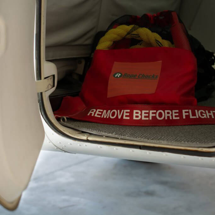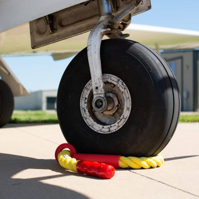 | Rope Chocks’ patent-pending design prevents vehicles, trailers, aircraft, equipment or anything with small to medium-sized tires/wheels from moving or rolling due to environmental conditions, uneven surfaces or bumps. Ideal for business, commercial, cargo and military aircraft. |