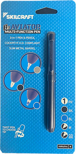 Special slim design fits flight suit and military uniform pockets, this medium-point 3-in-1 twist pen comes with two different colored ink, and a 0.5 mm pencil with eraser. Featuring non-reflective flat finish on a metal barrel, this pen is FOD compliant for cockpit and ramp safety. |