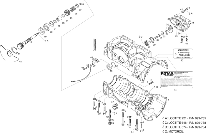 ROTAX 618 UL Engine Crankcase, rotary valve drive, water pump parts. Explanations of symbols and statements in part number charts: