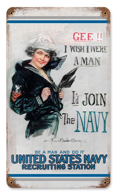 This Gee Navy vintage metal sign measures approximately 8-inches by 14-inches. Unlike most tin signs, they design and make their signs in the United States using 24 gauge American steel and a process known as sublimation, where the image is baked into a powder coating for a durable and long lasting finish. This sign is drilled and riveted for easy hanging. |