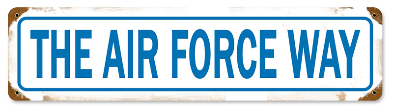 This The Air Force Way vintage metal sign measures approximately 20-inches by 5-inches. Unlike most tin signs, they design and make their signs in the United States using 24 gauge American steel and a process known as sublimation, where the image is baked into a powder coating for a durable and long lasting finish. This sign is drilled and riveted for easy hanging. |