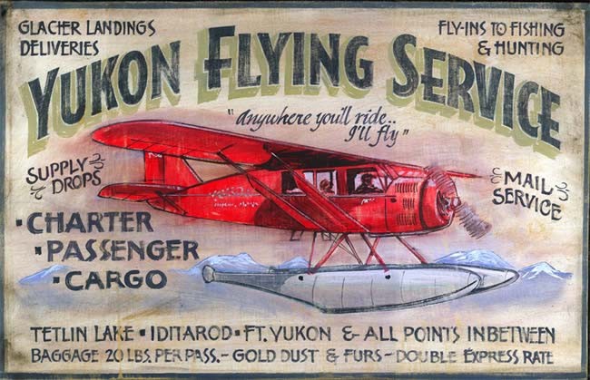 Yukon Flying - Printed directly on distressed wood panels that have knots or metal and other imperfections in them which gives each sign the look and feel of a real vintage sign. No two are the same! |